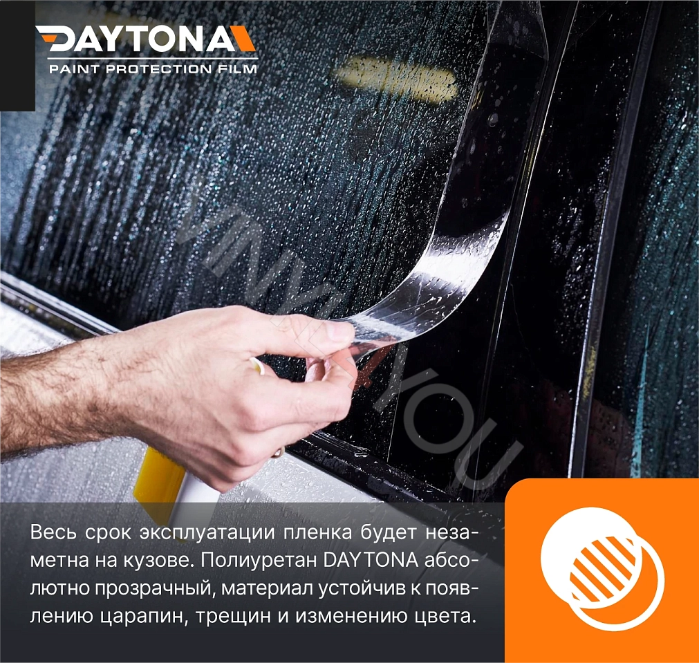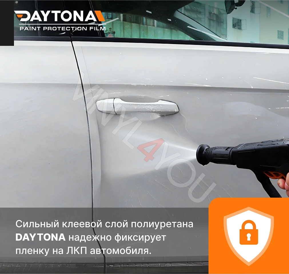 Полиуретан DAYTONA обеспечивает надежную долгосрочную защиту от механического и химического воздействий на ЛКП автомобиля. Лента сохранит состояние автомобиля, защищая основные зоны риска, на которые приходятся до 80% всех повреждений. «Гидрофобный эффект» лакового слоя отталкивает воду и грязь с поверхности пленки. Сильный клеевой состав надежно удерживает ленту DAYTONA на кузове, пленка не отклеится на мойке. При необходимости, полиуретан легко удаляется без остатков клея на лакокрасочном покрытии.