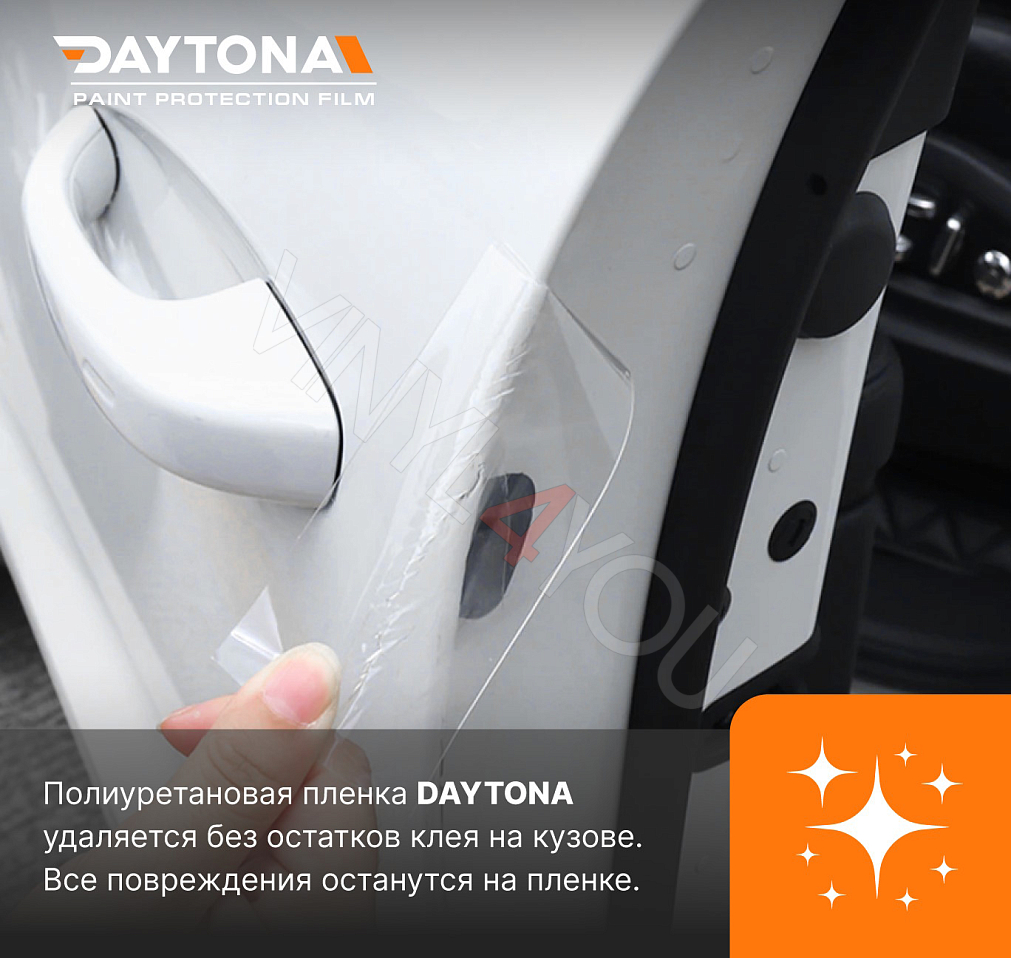 Полиуретан DAYTONA обеспечивает надежную долгосрочную защиту от механического и химического воздействий на ЛКП автомобиля. Лента сохранит состояние автомобиля, защищая основные зоны риска, на которые приходятся до 80% всех повреждений. «Гидрофобный эффект» лакового слоя отталкивает воду и грязь с поверхности пленки. Сильный клеевой состав надежно удерживает ленту DAYTONA на кузове, пленка не отклеится на мойке. При необходимости, полиуретан легко удаляется без остатков клея на лакокрасочном покрытии.